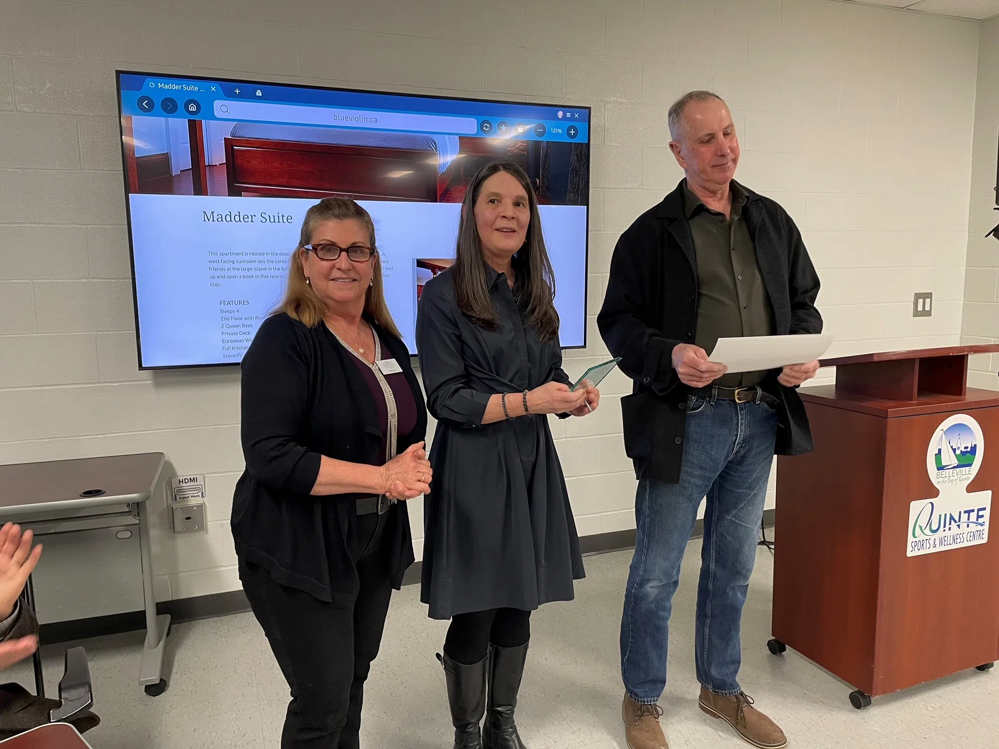 Nancy Roberts, Heritage Belleville committee member, presented the award for Outstanding Revitalization to Zubin Gillespie and Kim Fedor from Buhran Developments Inc. for their restoration of 212-214 Front Street (Cummins building). It is the company’s third restoration in downtown Belleville and the blue violin demonstrates creativity, detail and artistry in its two renovated suites.