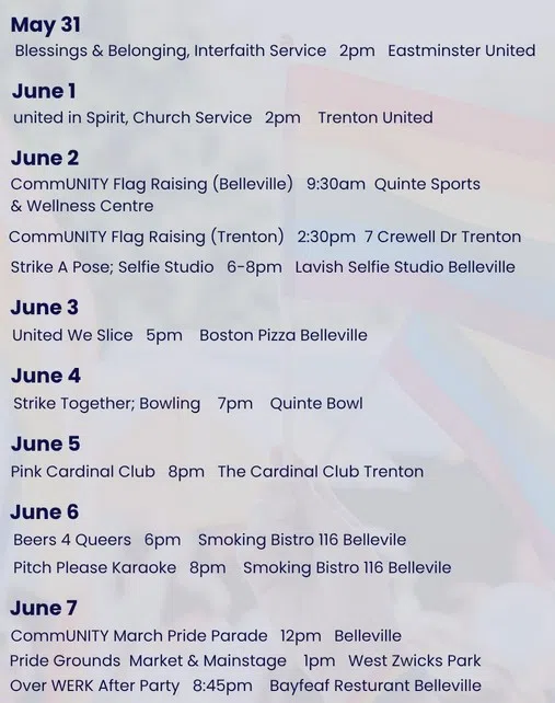 Locally, Bay of Quinte PRIDE has events scheduled throughout the week with this coming Saturday featuring the PRIDE Parade starting in downtown Belleville at noon, followed by vendors and entertainment and PRIDE After Dark in West Zwick’s Park.