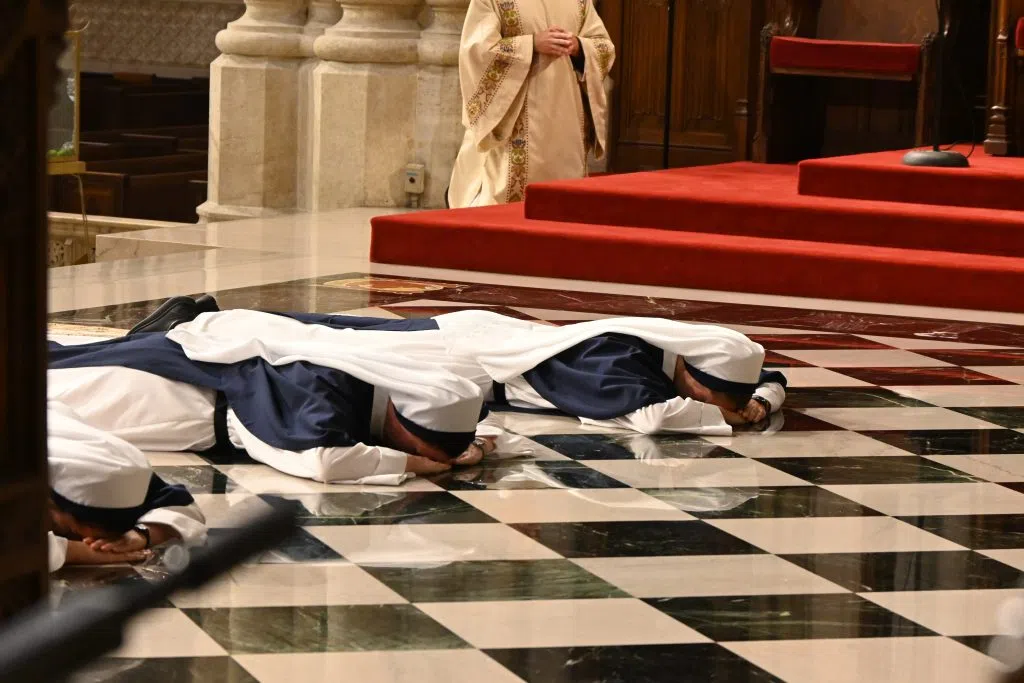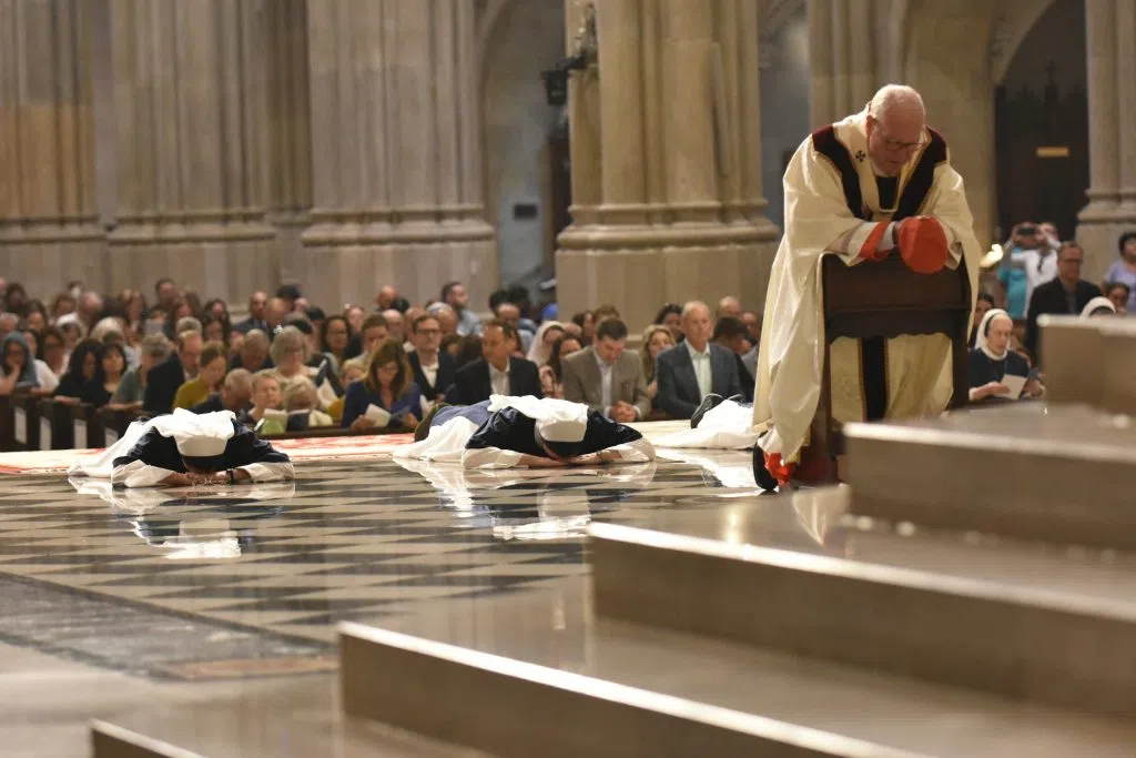 Sr Beata Victoria (Marlena Lougheed) and two other religious sisters prostrate during mass at St. Patrick’s Cathedral in New York City . Timothy Cardinal Dolan kneels in front (Photo: Sisters of Life)