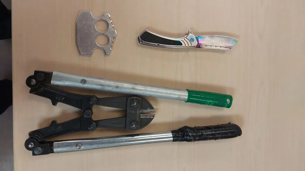 Both suspects were arrested and upon being searched officers located a number of items and weapons in the suspect’s possession. Along with some of the items believed to have been taken from porches in the area, officers also seized a can of bear spray, brass knuckles, a switchblade and two sets of bolt cutters.