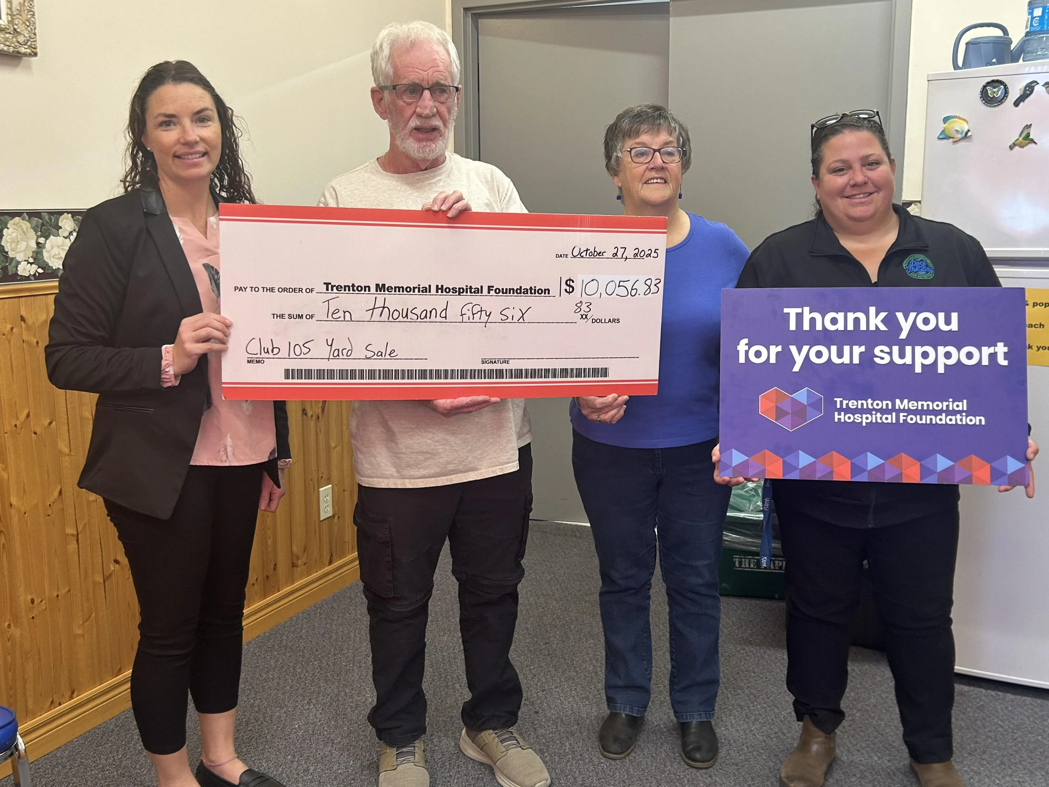 From left to right: Lindsay Butcher Dodds, Executive Director of the Trenton Memorial Hospital Foundation; Steven Rodgers, President of the Trenton Seniors Club 105; Sharon Urquhart, member of the Trenton Seniors Club 105; and Amanda Perrin, Community Engagement Coordinator with the Trenton Memorial Hospital Foundation, during the cheque presentation for the Seniors Club’s recent Yard Sale